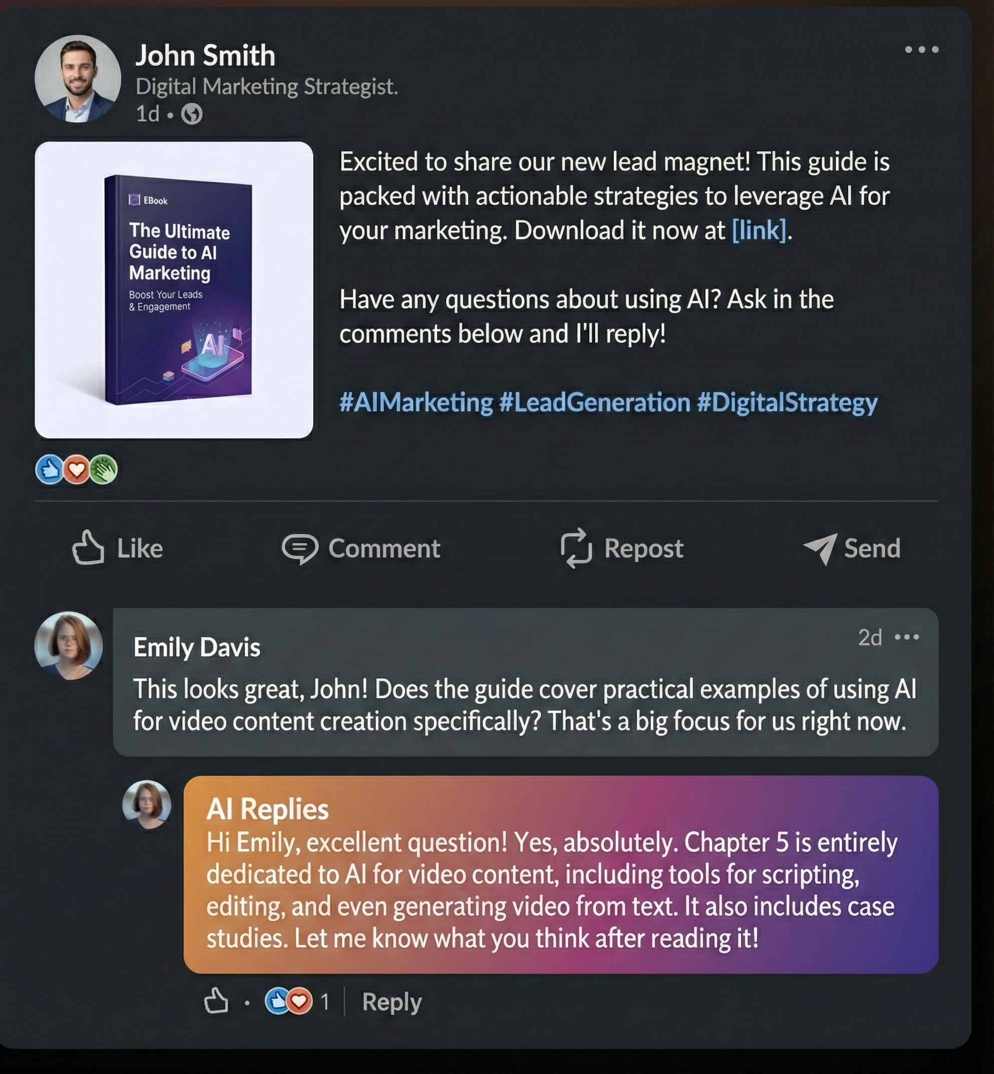 We help you turn organic post comments into qualified conversations, responding quickly and sharing the resources people are already asking for.